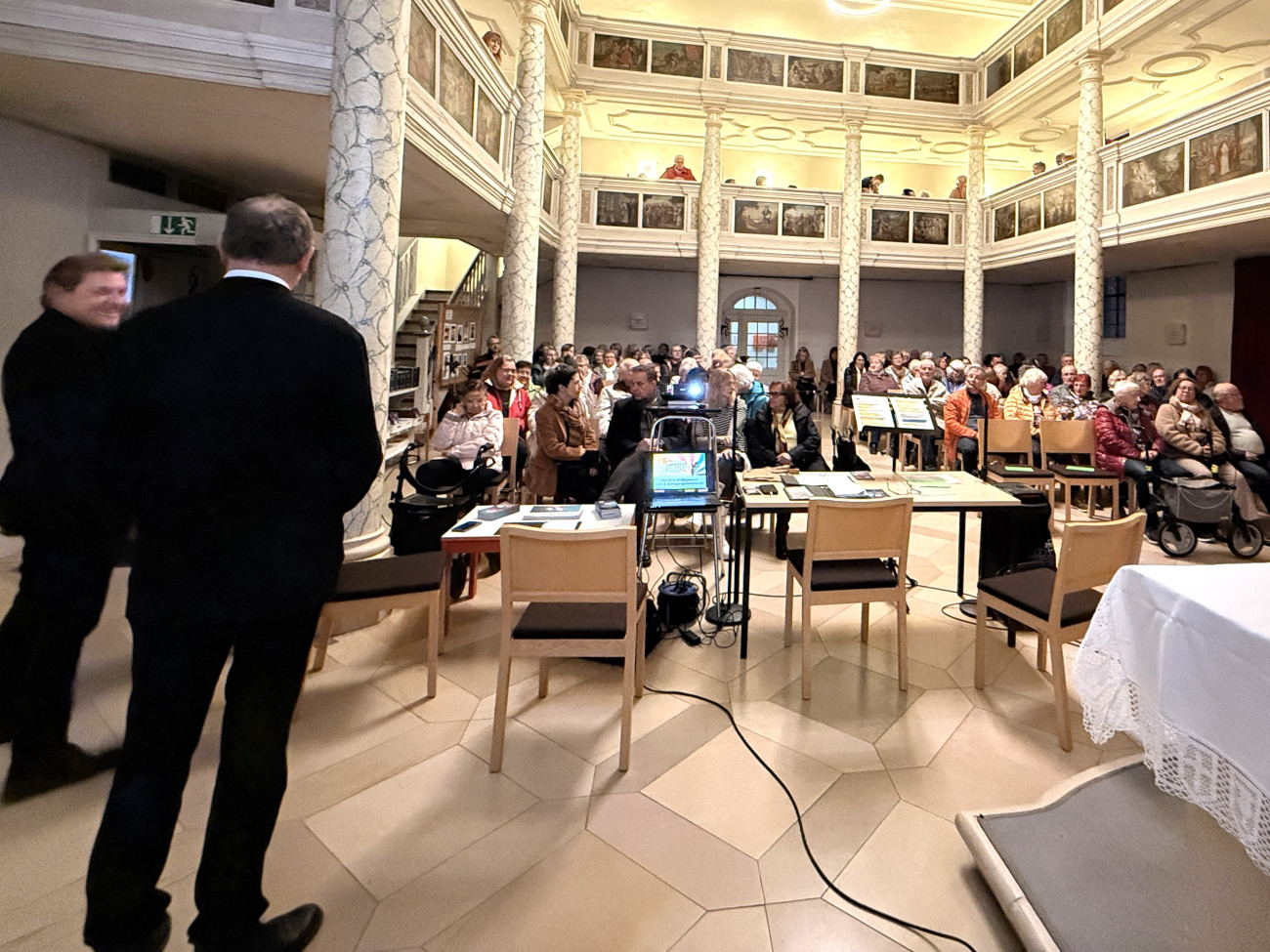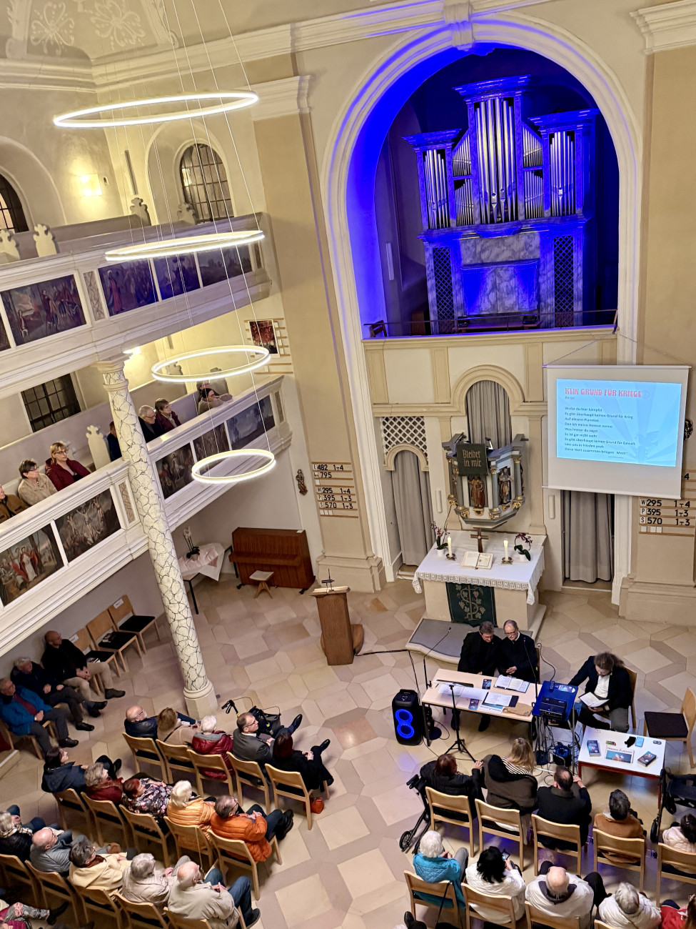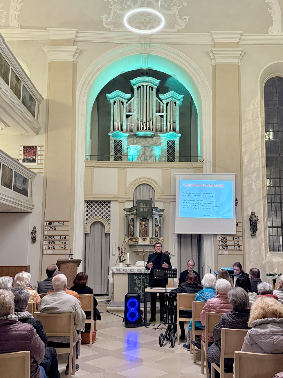 Rainer Ludwig und Friedrich Hohenberger lockten mit Gebet, biblischer Lesung und vielen bekannte Friedensliedern in die voll besetzte Spitalkirche.